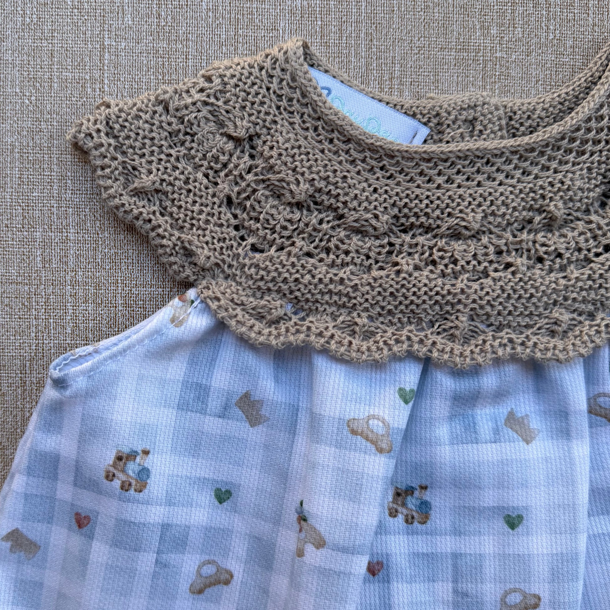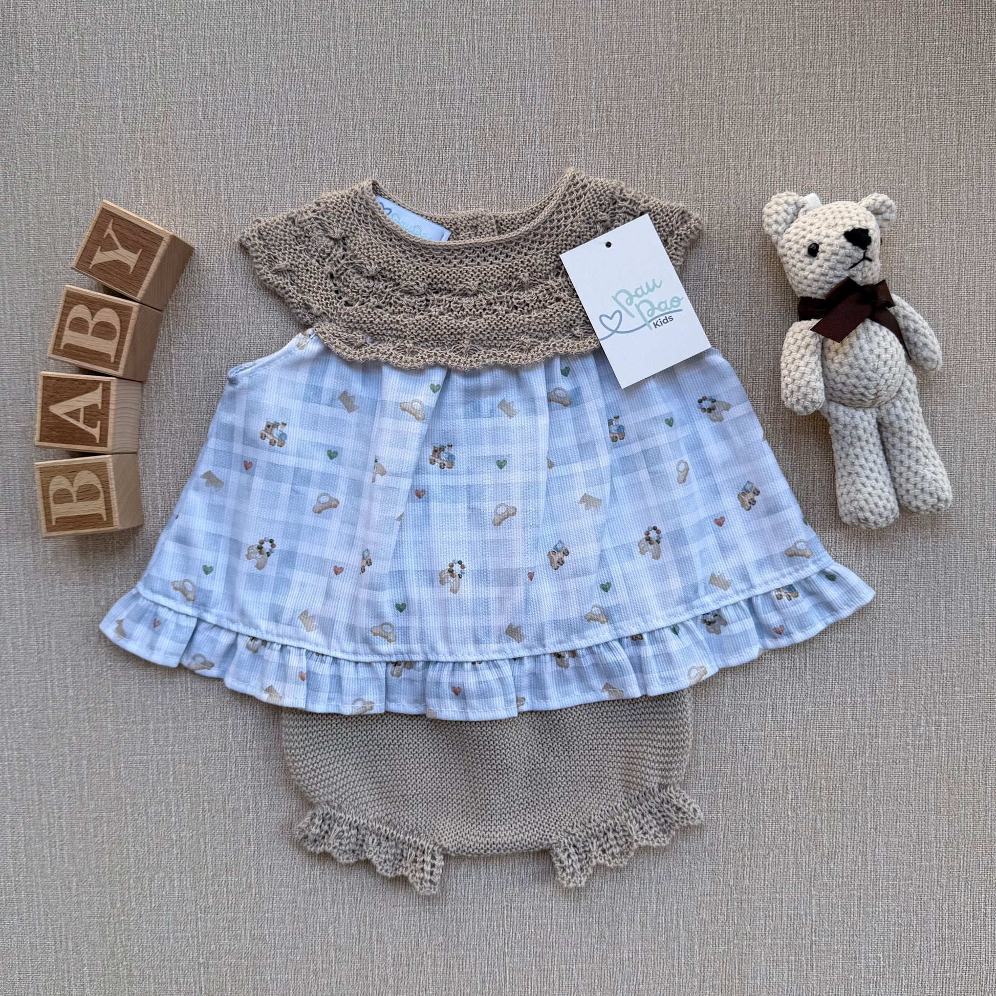El Vestido y Braguita de punto es una opción versátil y delicada, ideal para los días soleados de primavera y verano. Su cuerpo de punto calado en un suave tono lino se complementa a la perfección con una falda vaporosa adornada con un encantador estampado de cuadros y motivos infantiles. Cada detalle de este conjunto irradia frescura y elegancia. Además, la braga a juego, confeccionada en el mismo punto, añade un toque de comodidad y delicadeza al look.