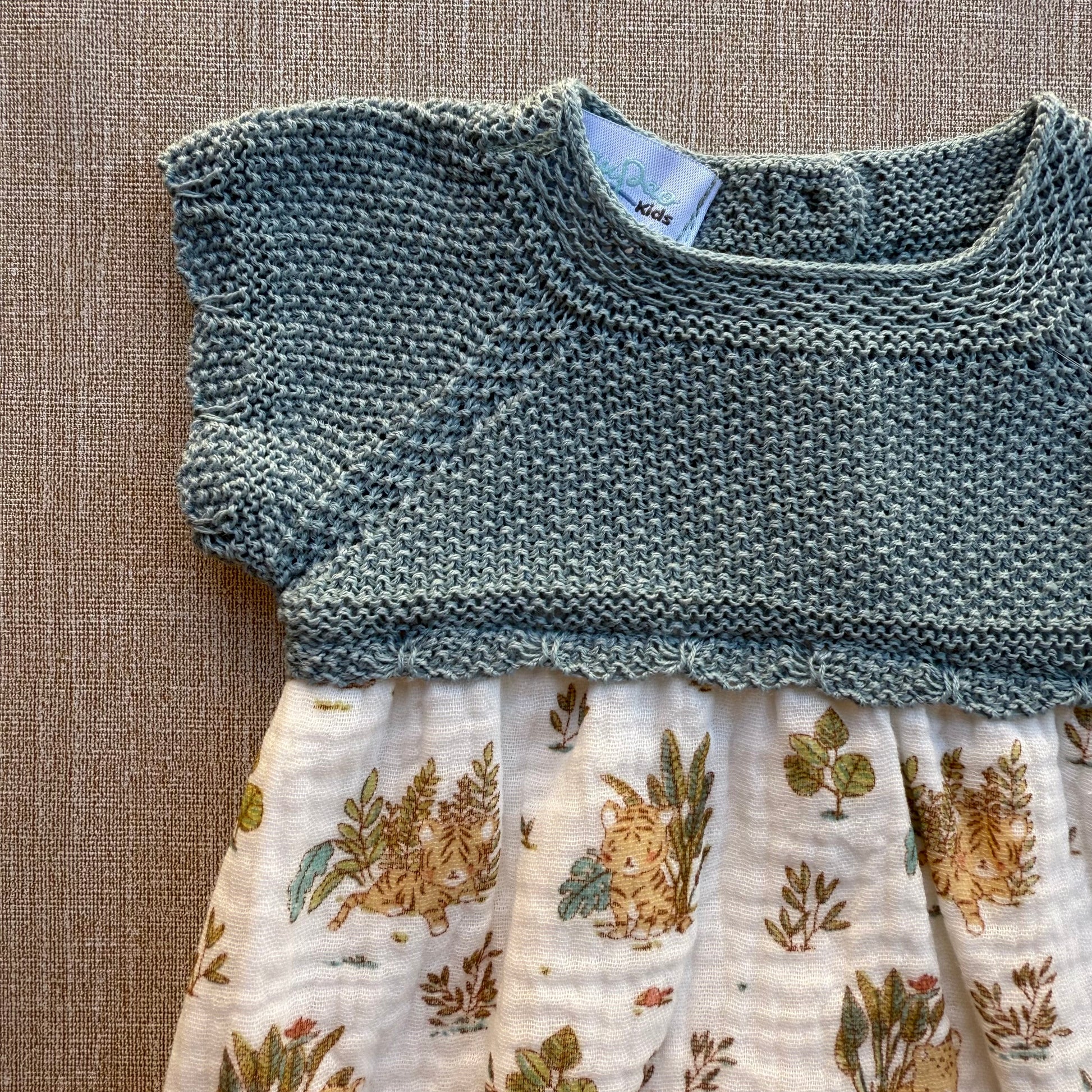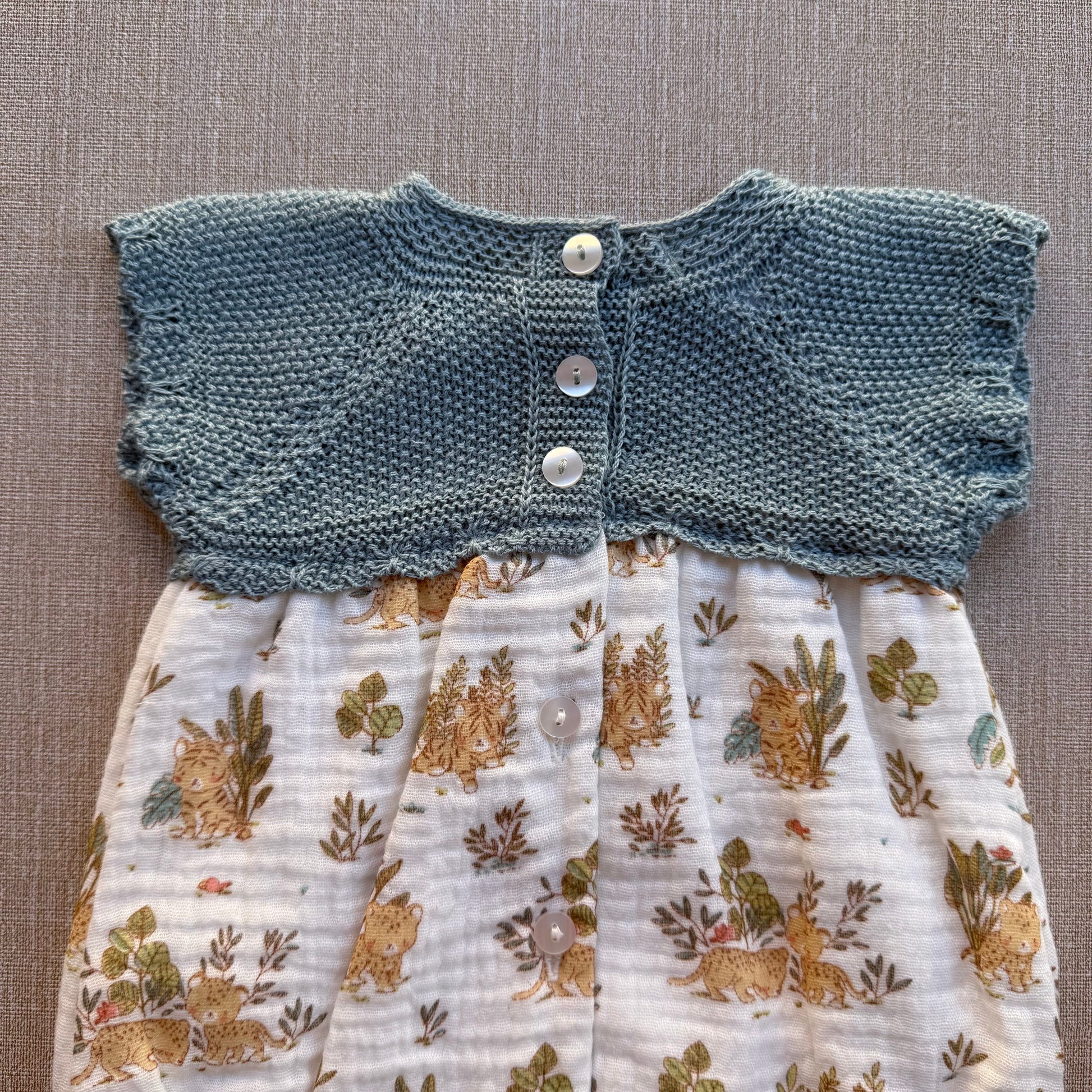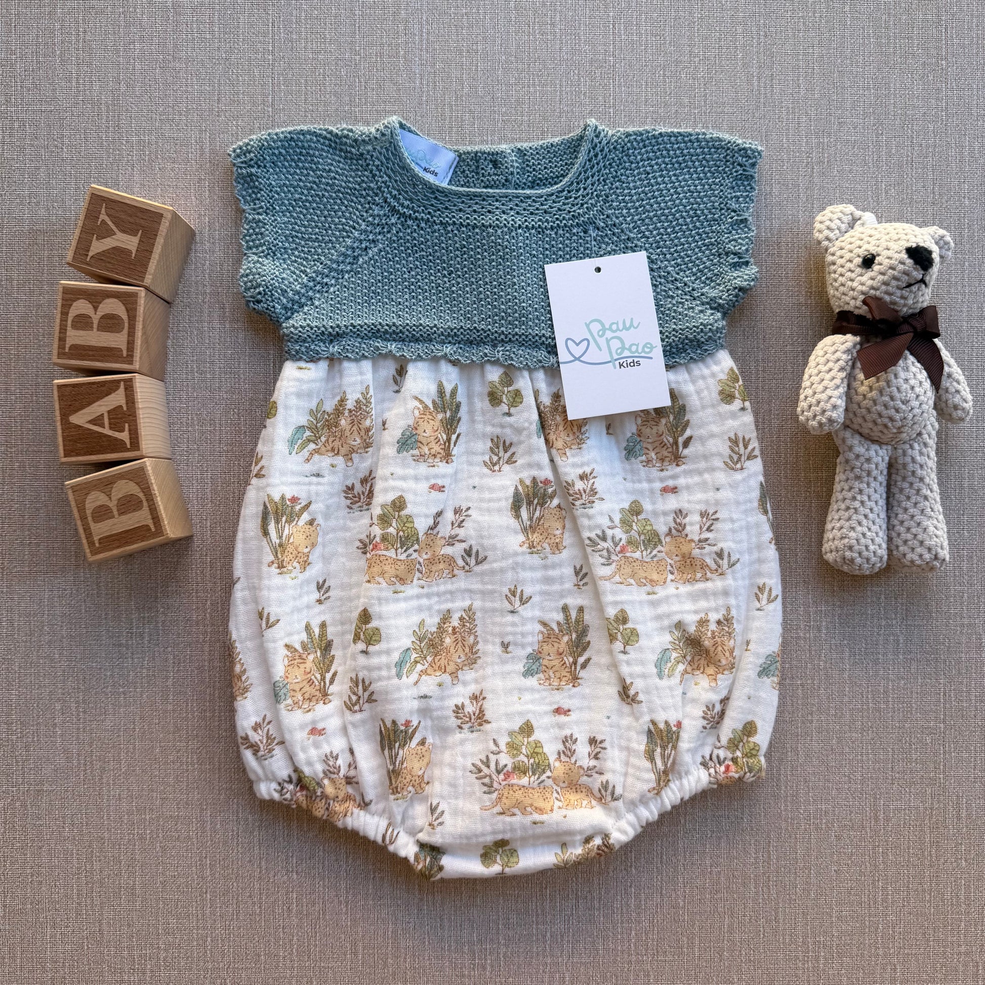 La parte superior, tejida en punto verde azulado, ofrece suavidad y comodidad, mientras que la parte inferior, confeccionada en algodón ligero con un encantador estampado de conejitos y plantas, es perfecta para mantener a tu bebé fresco y adorable en cualquier ocasión.