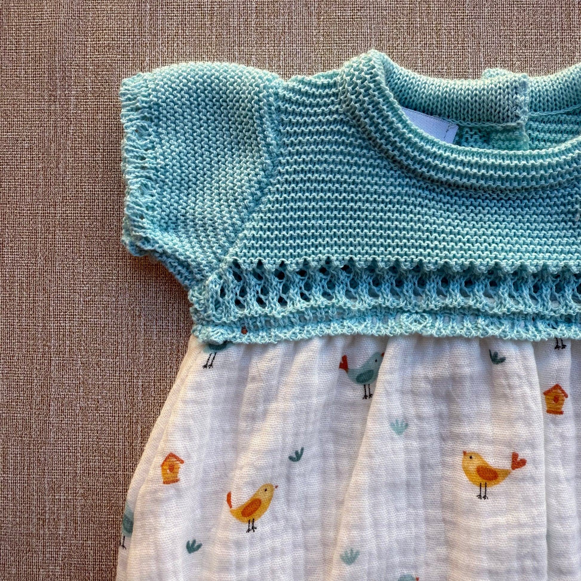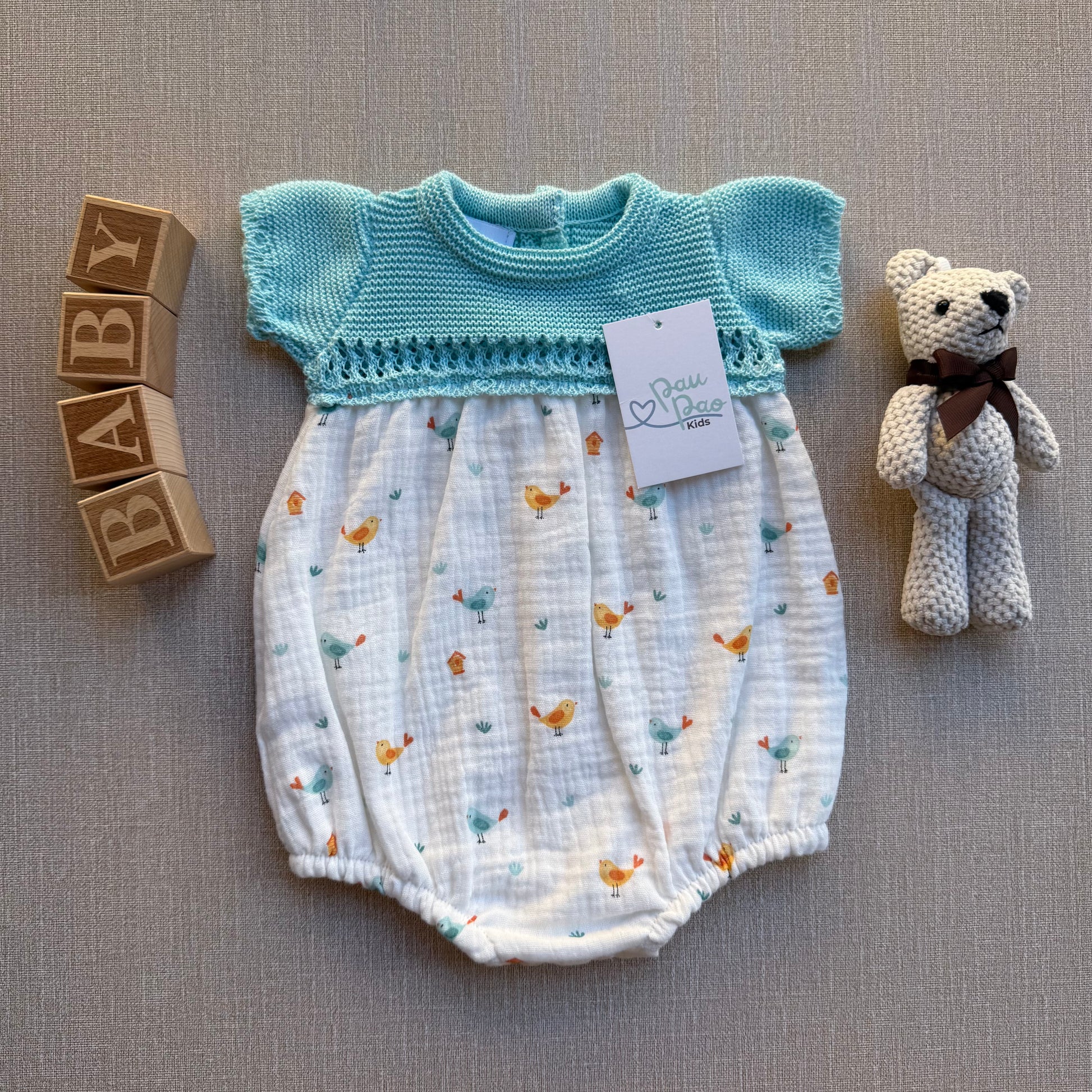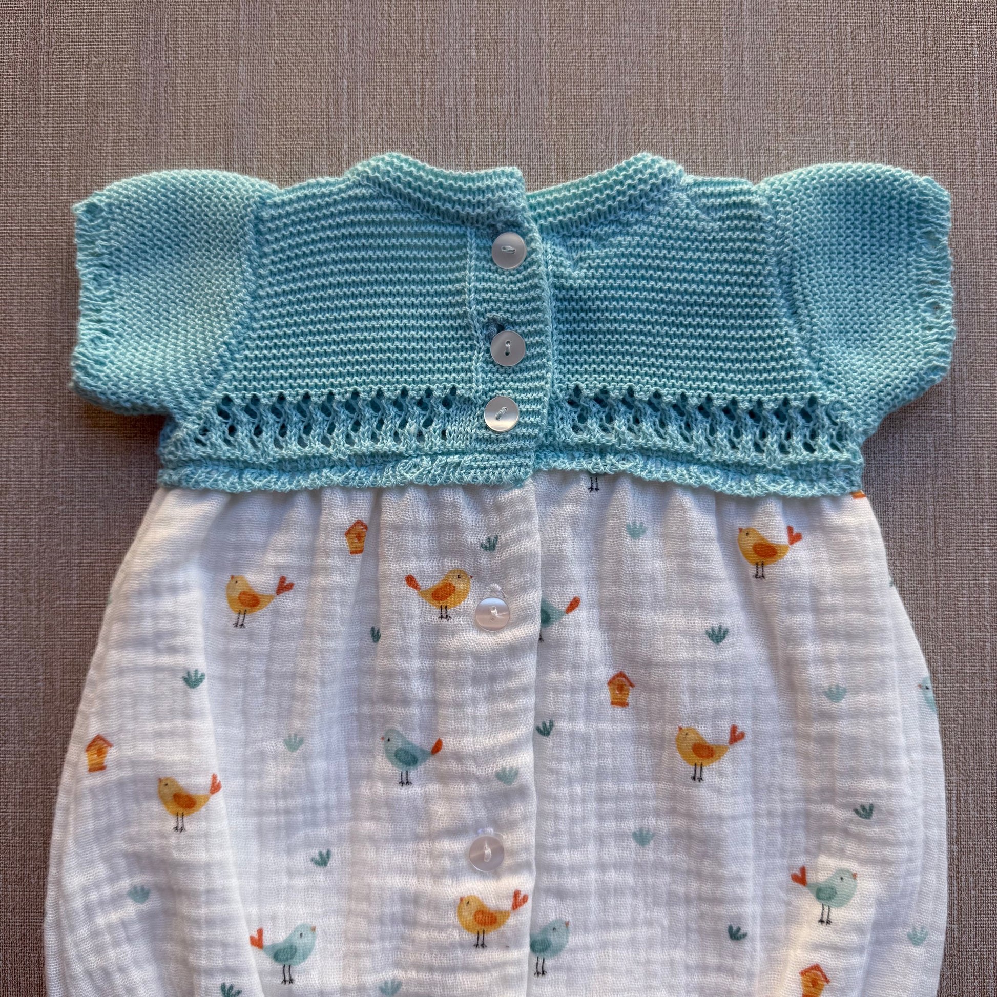 El Pelele Magia es una prenda fresca, cómoda y cuenta con un diseño encantador que hará que tu bebé luzca adorable en cualquier ocasión. La parte superior está tejida en un suave punto de color aguamarina, adornada con delicados detalles calados, mientras que la parte inferior está confeccionada en una tela ligera con un alegre estampado de pajaritos. Ideal para los días de primavera y verano, combina suavidad, estilo y funcionalidad, acompañando cada movimiento de tu pequeño con total libertad.