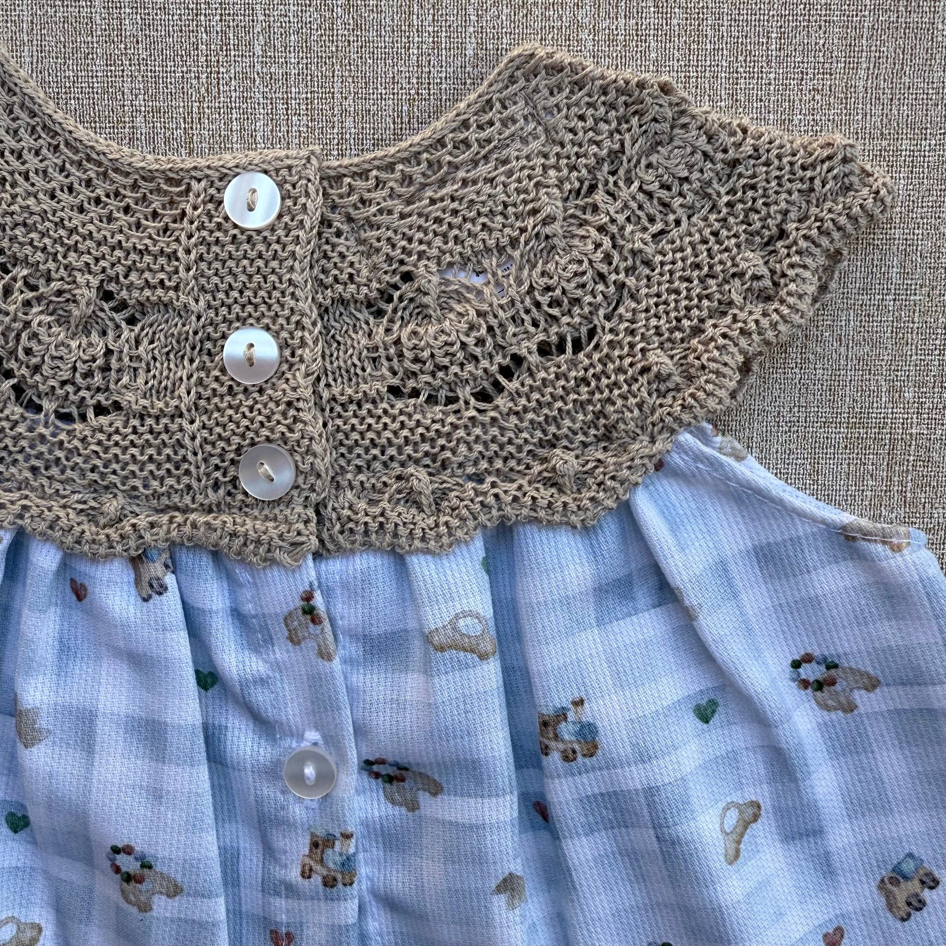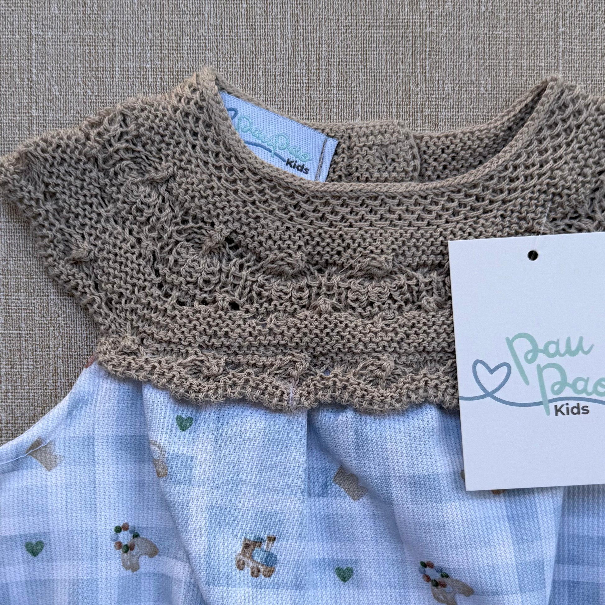 El Pelele escubre la combinación perfecta de encanto, comodidad y frescura en esta prenda única para tu bebé. Con un delicado cuerpo de punto calado en un suave tono lino y una parte inferior elaborada en algodón con un encantador estampado de cuadros y motivos infantiles, este pelele es ideal para los días soleados de primavera y verano. ¡Tu pequeño lucirá adorable y estará cómodo todo el día!