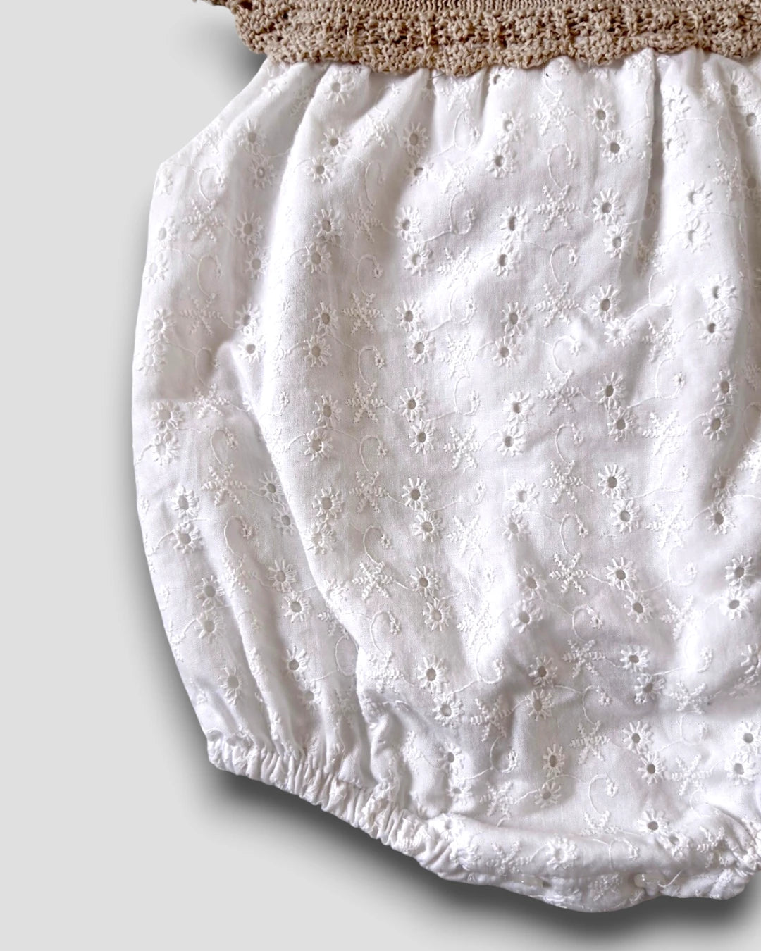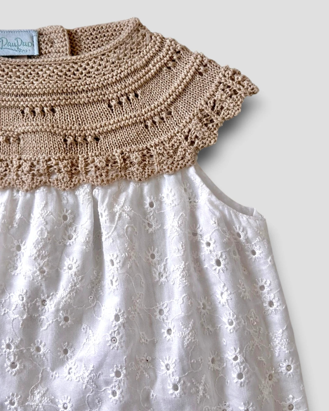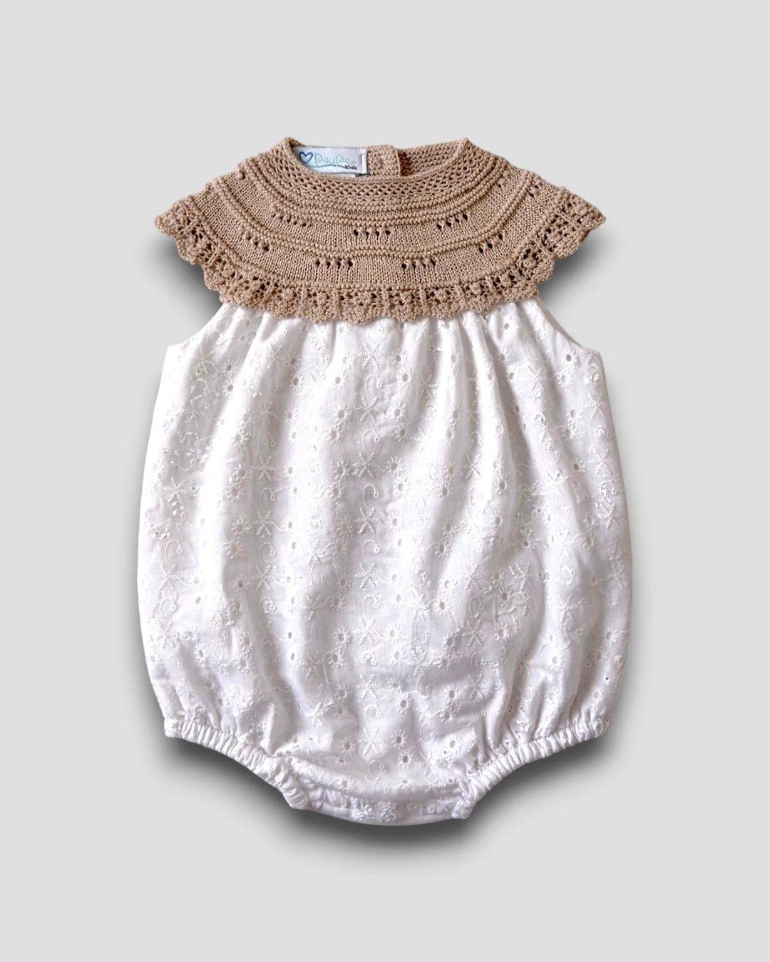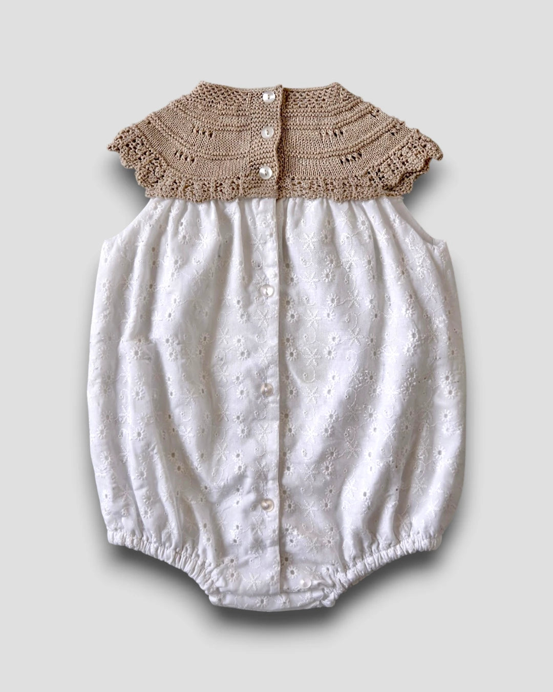 El Pelele Roble de punto y tela bordada 100% algodón, con botones en la parte trasera y en la parte inferior para facilitar su puesta.