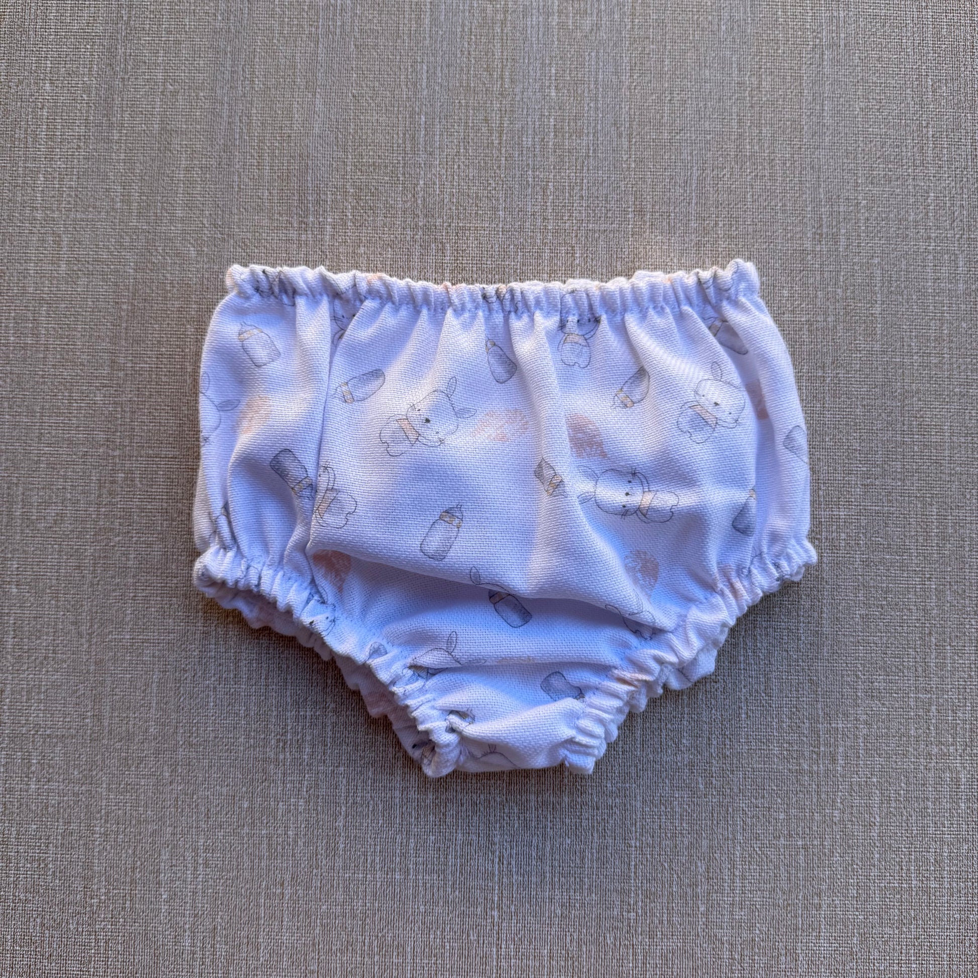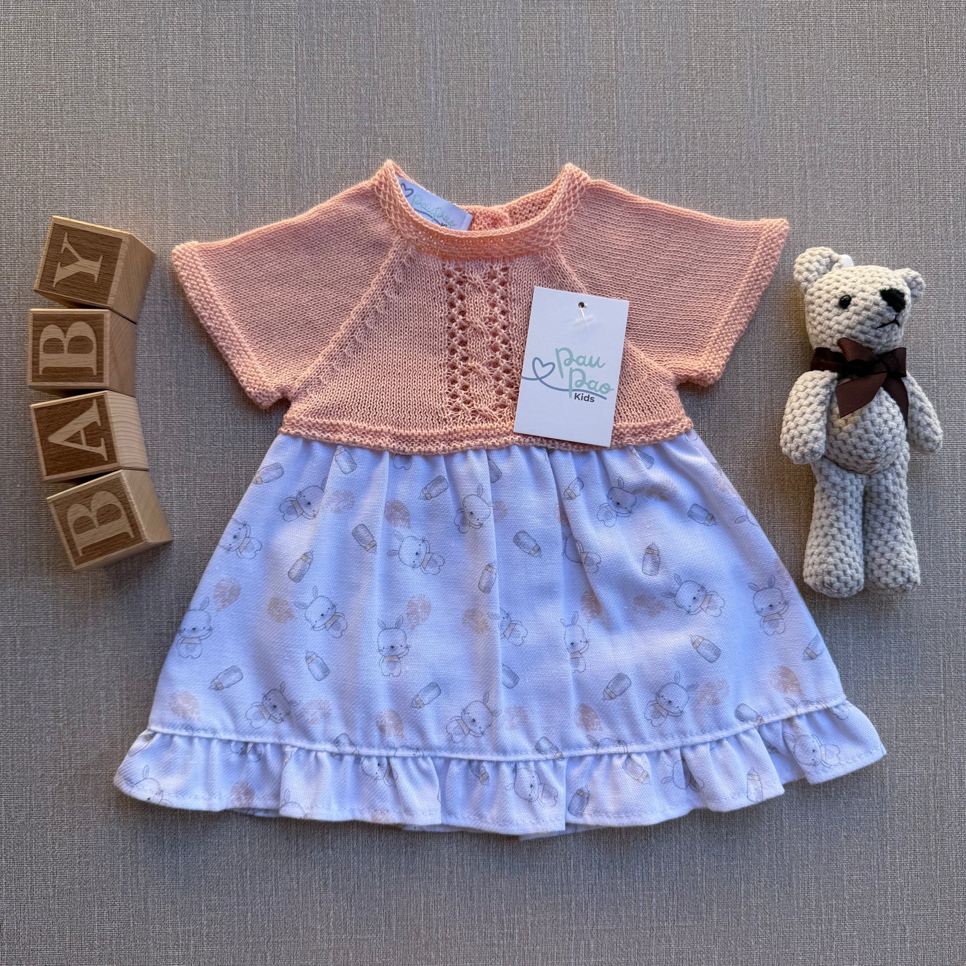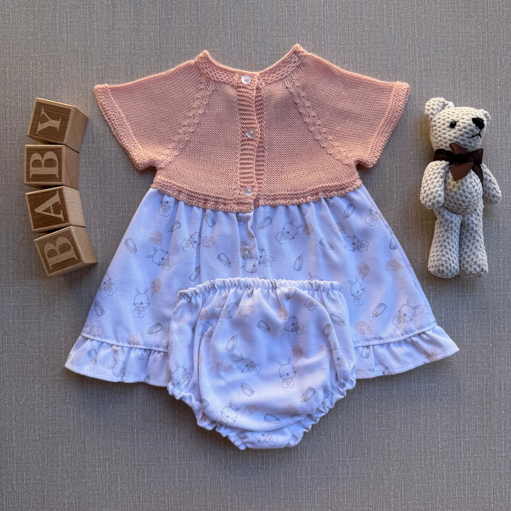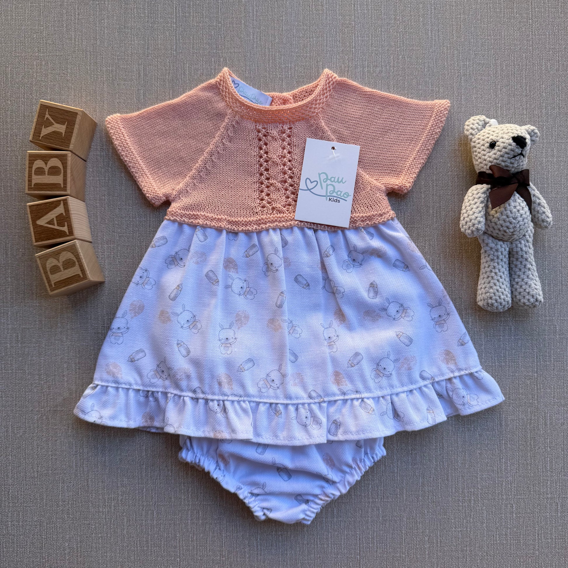El Jesusito y braguita Océano es la combinación perfecta de elegancia y comodidad para tu bebé. La parte superior de punto melocotón, adornada con delicados detalles en el tejido, se complementa a la perfección con una falda de algodón ligero que presenta un delicado estampado de conejitos y biberones, realzando la ternura del bebé. Ideal para primavera, verano y otoño.