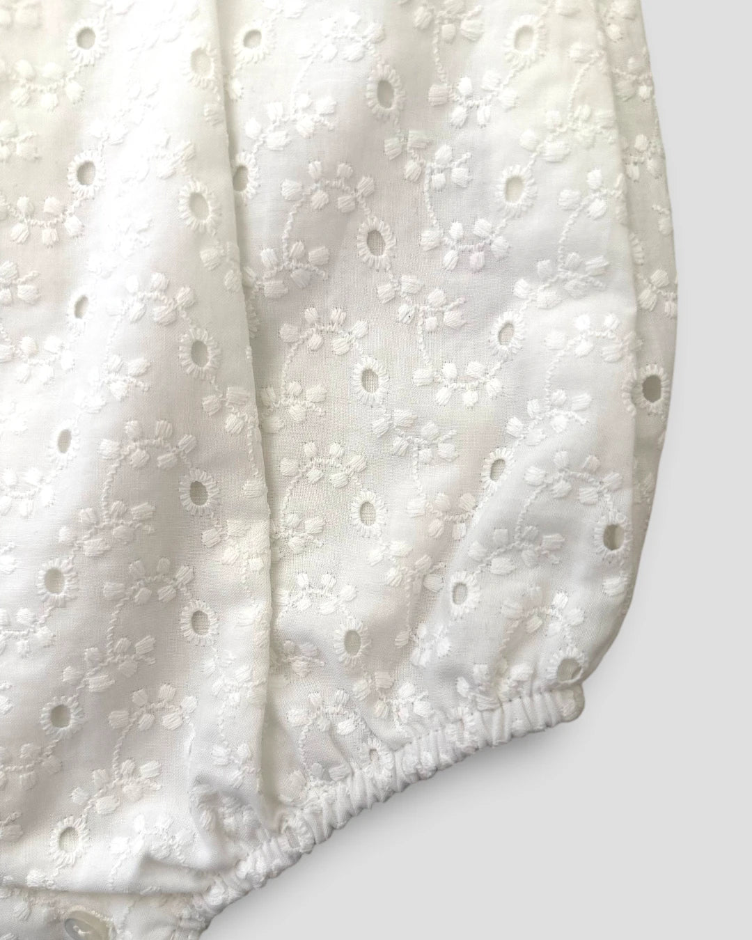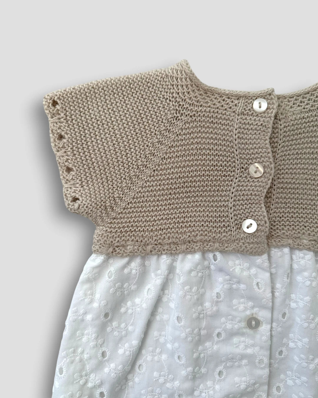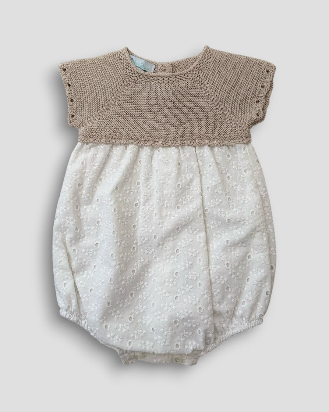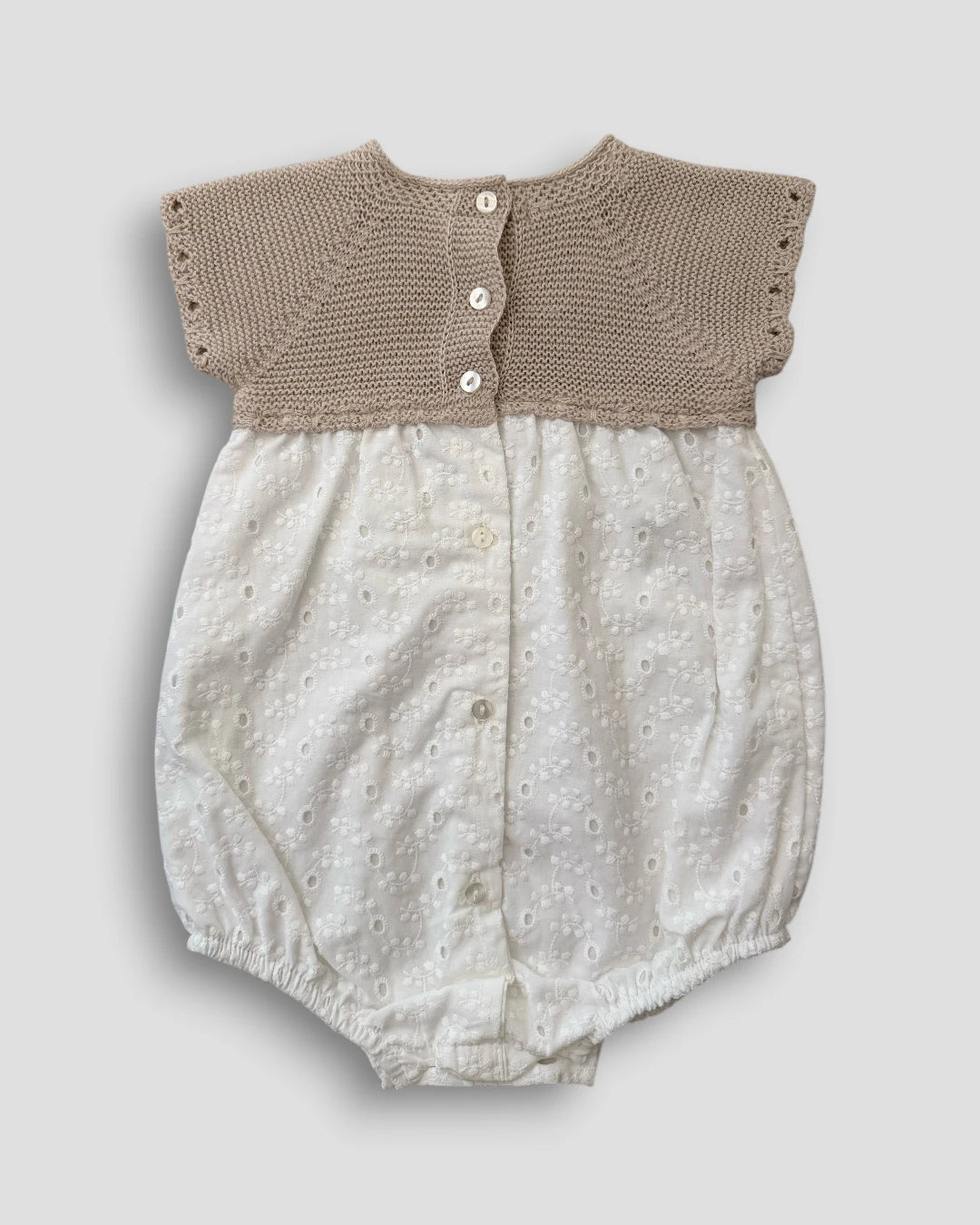 Un pelele delicado y atemporal que combina un suave punto en tono avellana con un tejido bordado ligero y elegante. Diseñado para cuidar la piel del bebé y permitirle moverse con total comodidad durante todo el día.