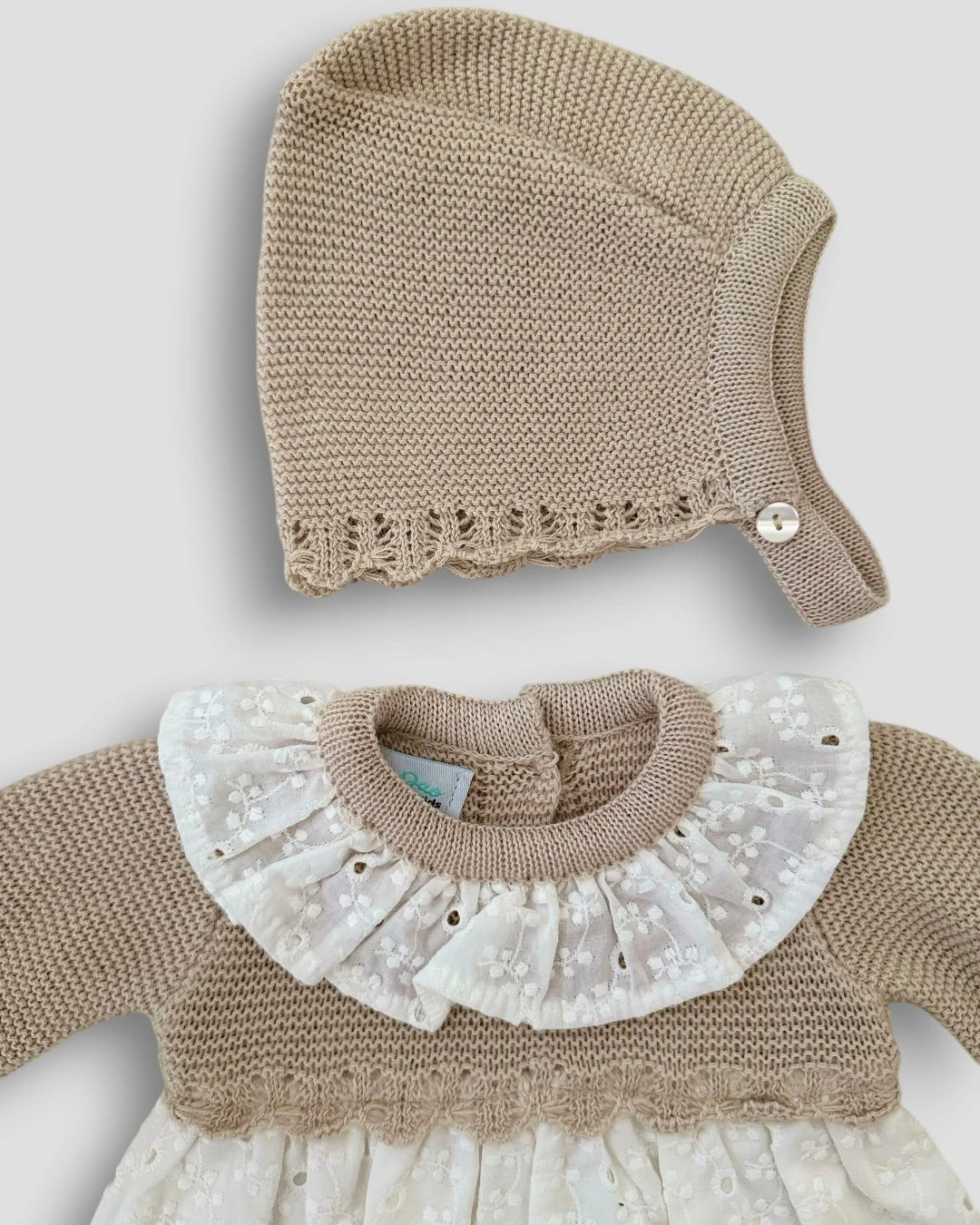 Un conjunto delicado compuesto por vestido y capota a juego. Combina un suave punto en tono avellana con un tejido bordado ligero que cuida la piel del bebé y aporta un estilo clásico y elegante.